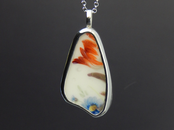 Pendant made from a shard from an original two hundred year old Nantgarw porcelain plate. The shard has been encapsulated in hallmarked sterling silver and supplied with a 20inch solid silver chain.